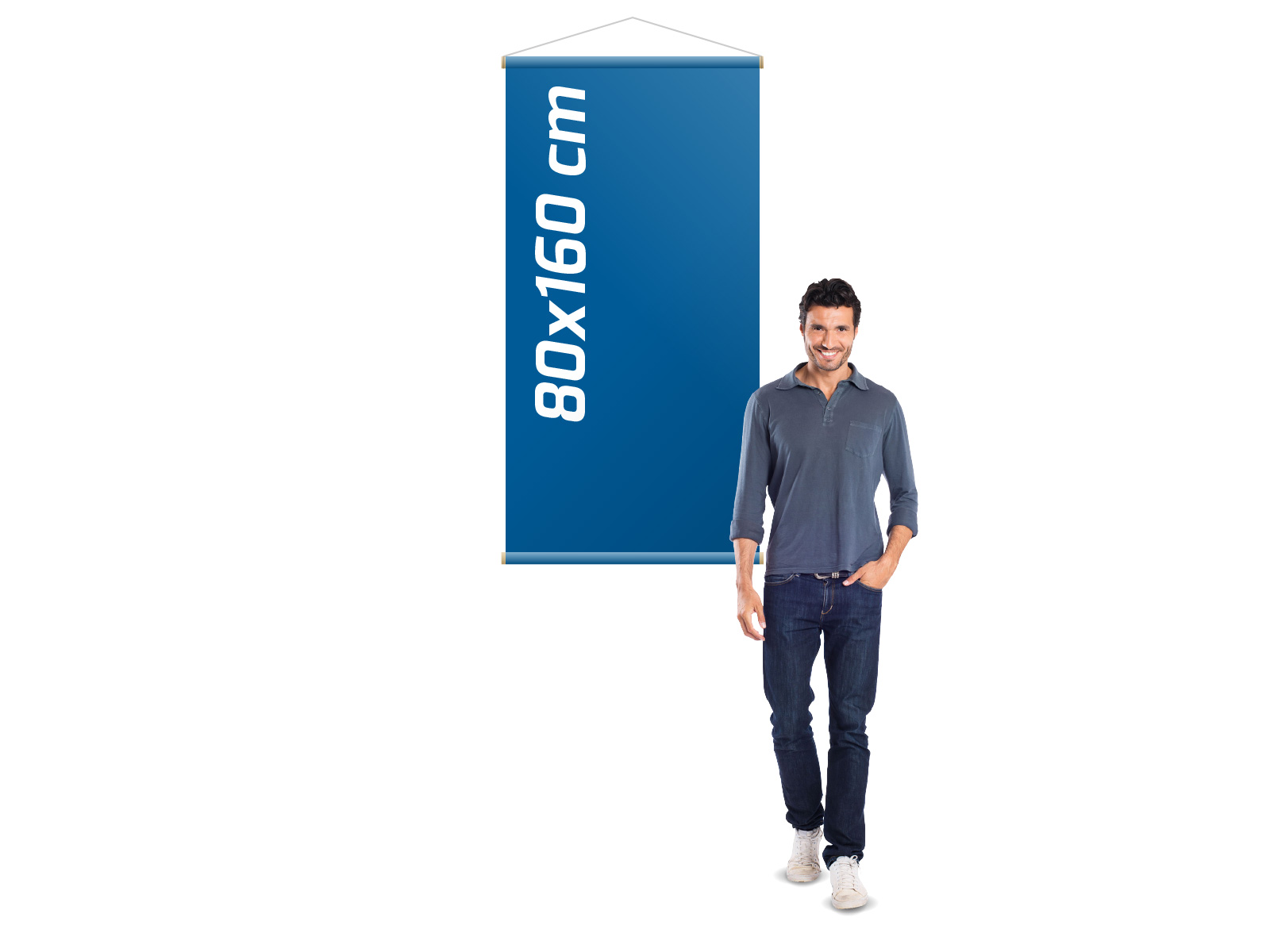 - Size of kakemono : 80 x 160 cm - Material PVC 450 g - Finishing sheath at top and bottom - 1 suspension bar made of aluminium - 1 ballast bar made of aluminium - High definition digital printing (front only) - Suspension cable not supplied